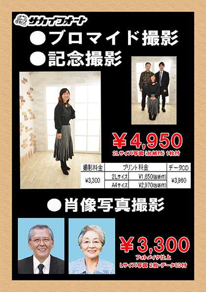 ●ブロマイド撮影 ●記念撮影 撮影料金 3300円 2L写真(台紙付) 1,650円 A4写真(台紙付) 2,970円 データCD 3,960円 ●肖像写真撮影 フォトメイク加工 Lサイズ写真2枚・データCD付 約1時間仕上 3,300円 |